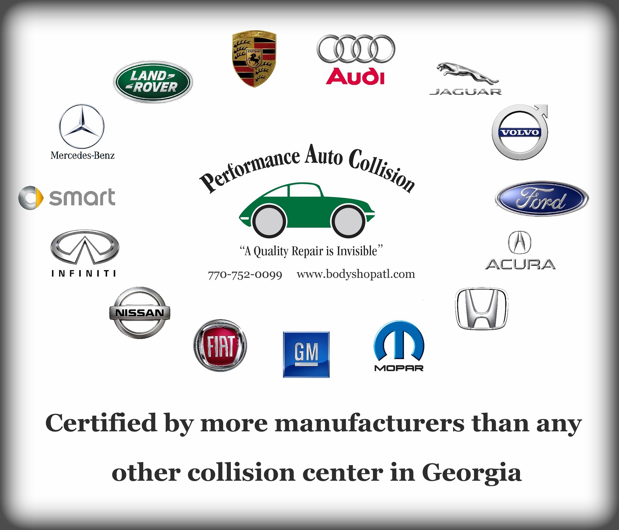 Performance Auto Collision is Atlanta metro's premier collision repair center! Being certified by nearly twenty auto manufacturers, you can rest assured that we know exactly how to put your car back to pre-accident condition! From Porsche's to pick-up trucks, our highly trained and experienced staff prides itself on every detail of every repair!
